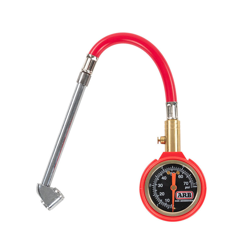 Sterkur og nákvæmur loftþrýstingsmælir frá ARB með stórum, auðlesnum mælikvarða og mjúku gúmmíhúðuðu yfirborði. Mælirinn er með sveigjanlegri slöngu og losunarhnappi til að fínstilla þrýsting á einfaldan hátt.