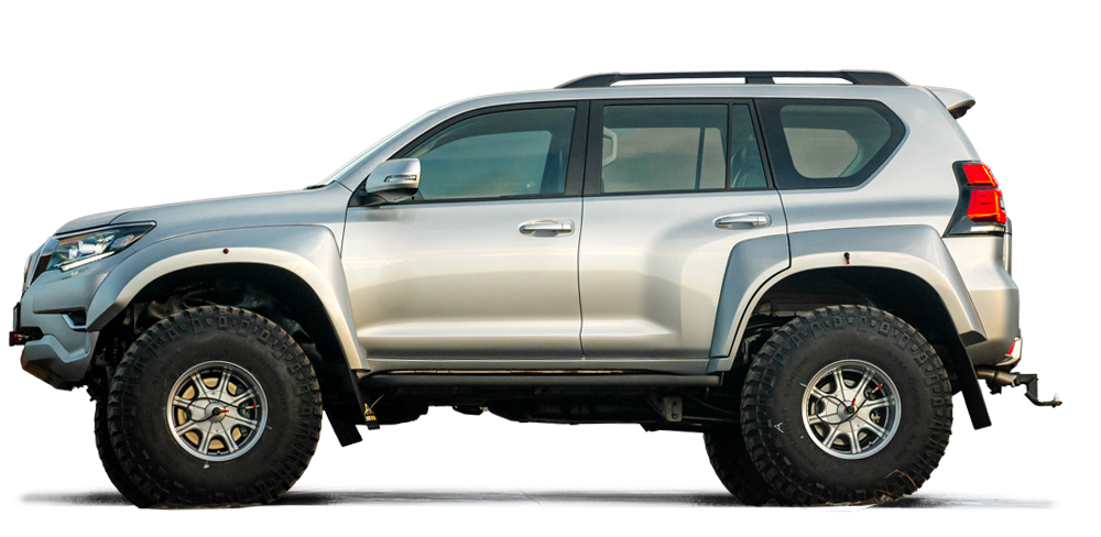 Svo hægt sé að koma öflugum 42” jeppadekkjum undir Land Cruiser 150 til að hann geti fjaðrað í torfærum þarf að búa til enn meira pláss. Þetta er gert með því að síkka fjöðrunarbita að framan, síkka afturfjöðrun og færa afturhásingu lengra aftur. Ennfremur þarf að auka svigrúm í hjólskálum og færa til búnað undir vélarhlíf. Breiðir og háir brettakantar prýða bílinn og ný innri bretti verja hjólaskálar og búnað fyrir innan. Spindlar og fjöðrun að framan eru styrkt til að takast á við aukna yfirferð og álag sem myndast vegna stærri jeppadekkja.