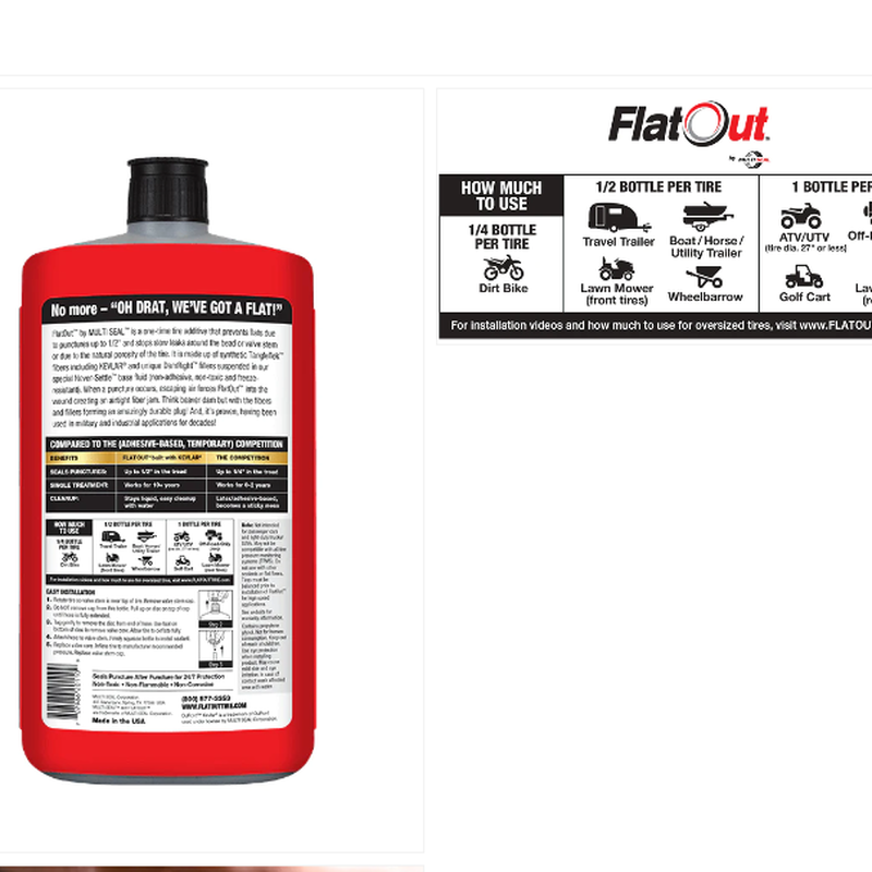 Flatout Sealant getur komið þér til byggða þegar á reynir, þéttir altt að 1/2 tommu gat. Helst fljótandi og virkar í allt að 10 ár, auðvelt að þrífa með vatni.