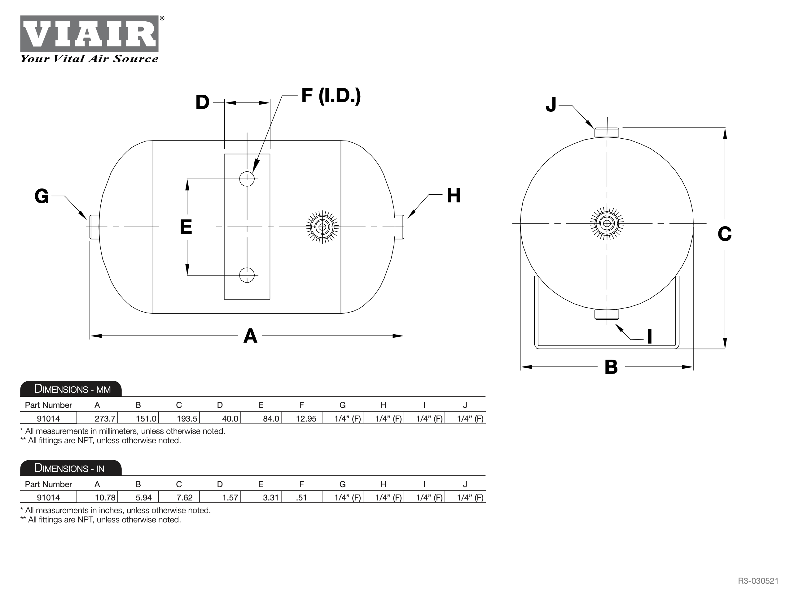 3,79 lítra loftkútur frá Viair með 4 portum, uppgefinn fyrir 150 psi.
