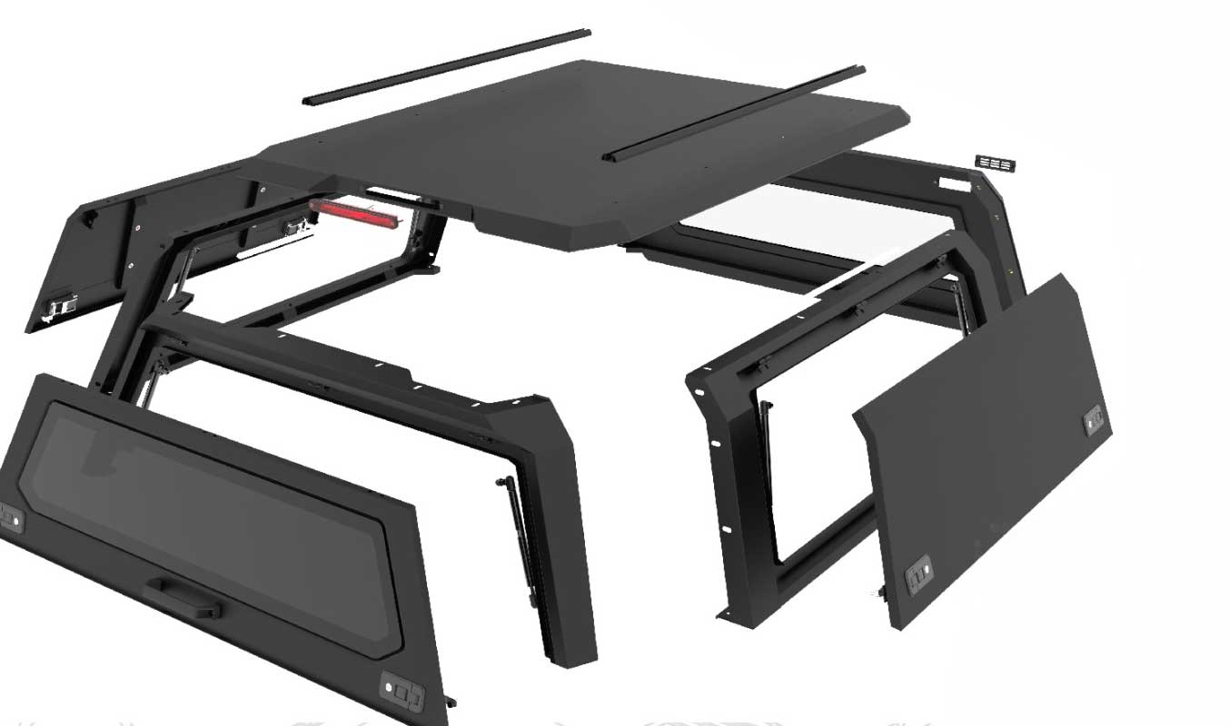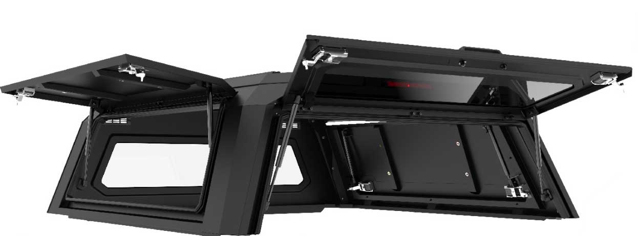 Sterkbyggt pallhús smíðað úr ryðfríu stáli með sterkri húðun yfir. Húsið kemur með sterkum hurðapumpum og öflugum læsingum ásamt því að vera með rennukerfi á þaki. Burðaþol 150 KG á ferð og 400KG stopp sem gerir það tilvalið til að hýsa topptjald.