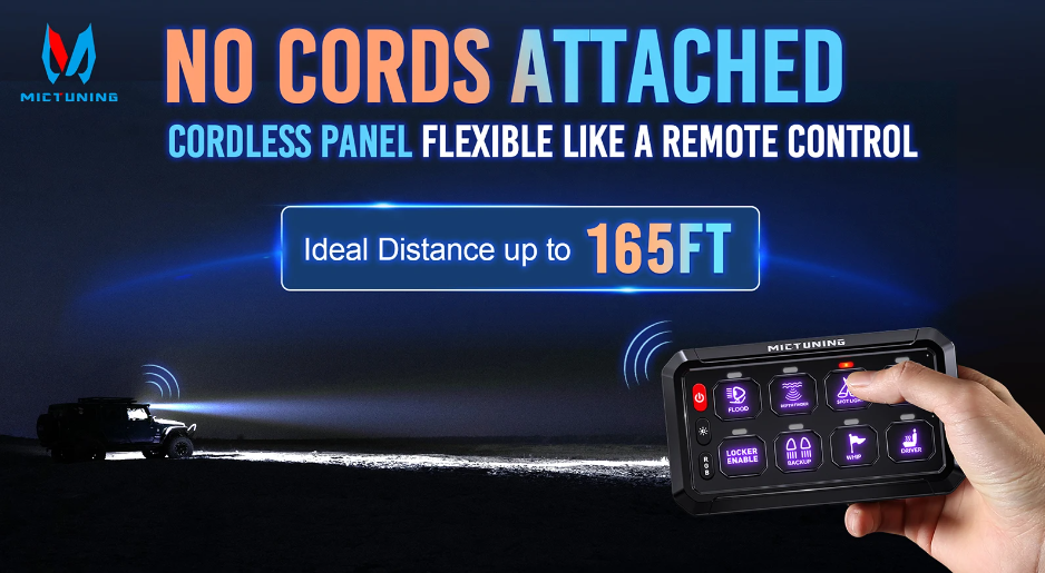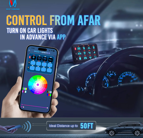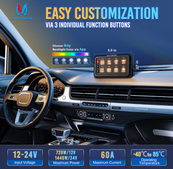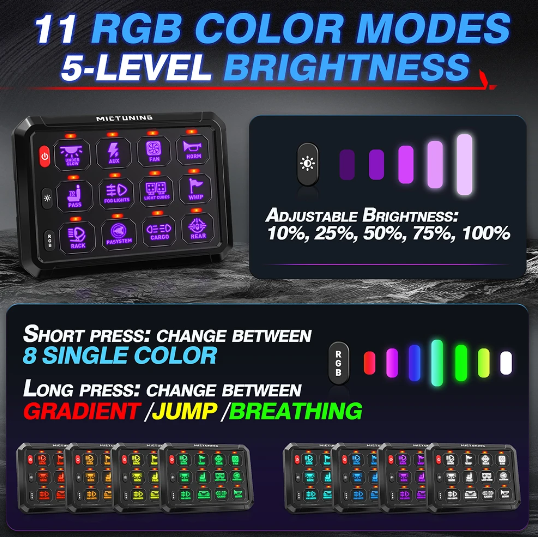 Rofaborð með 12 rofum og RGB lýsingu. Hægt er að tengja rofaborðið við app og stýra í gegnum síma einnig. Gengur á 12-24v rafkerfi.