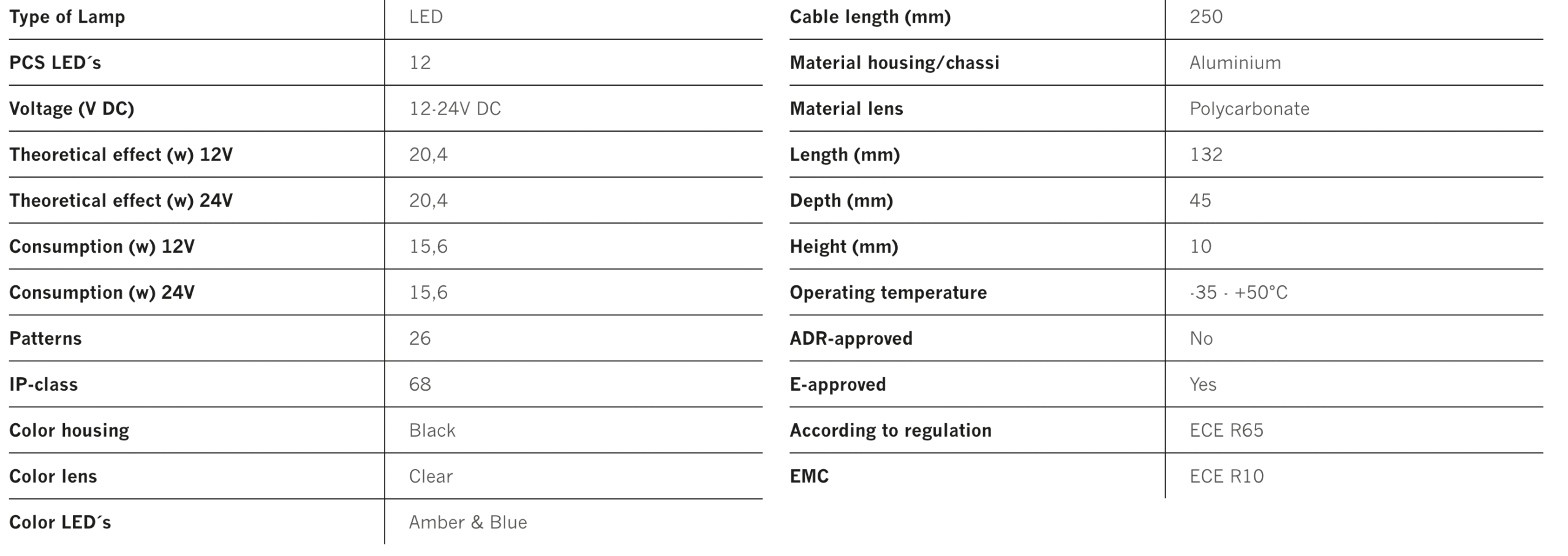 Mjög nett tvívirkt blikkljós með 12 LED díóðum bæði appelsínugult og blátt. Hönnun og notagildi sameinast í þessu ljósi. LxDxH: 132x45x10 mm